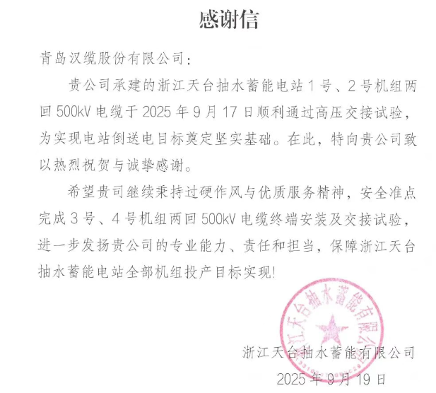值得一提的是,憑借在電纜設計聯絡、設備制造到現場安裝等方面的出色表現,漢纜股份收到業主單位——浙江天臺抽水蓄能有限公司發來的感謝信。信中對漢纜股份為1#、2#機組兩回500kV電纜及附件順利通過竣工試驗所提供的專業技術支持和高效服務表示充分肯定。