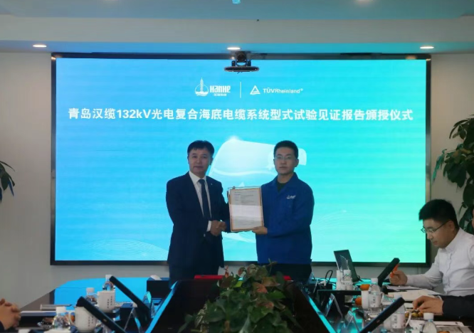 在與會(huì)嘉賓的共同見證下,TÜV萊茵青島公司執(zhí)行董事王會(huì)波向漢纜股份代表頒發(fā)了《132kV光電復(fù)合海底電纜系統(tǒng)型式試驗(yàn)見證報(bào)告》。緊接著,漢纜股份董事長張立剛與TÜV萊茵青島公司執(zhí)行董事王會(huì)波共同簽署了《出海戰(zhàn)略合作框架協(xié)議》。